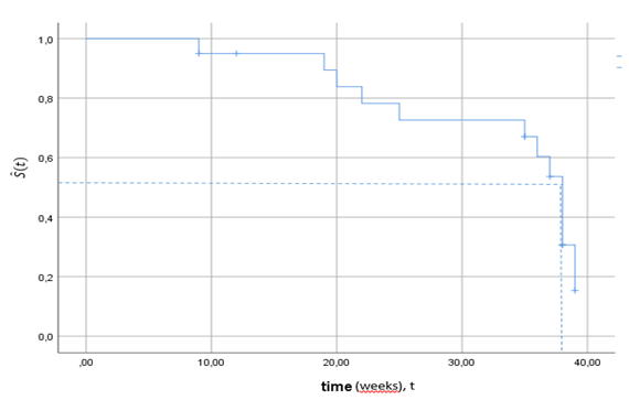 At first sight, we can detect the difference in the survival probability by assessing the curves only, but this method is not always informative. The distance between, or some visual deviations in curves might be not statistically significant. For instance, we can make use of the survival curves and compare the median of survival times in the groups of interest. The median time might be determined by drawing a perpendicular from the y-axis to the survival curve at and then erecting the perpendicular from the x-axis up to the intersection to the same point on the curve. For the demonstration purposes, we used twenty observations of the diploid group drawn from the data provided by Heagerty9 on the breast cancer (Figure 2. The median of the survival time for the diploids was approximately 36-37 weeks.
