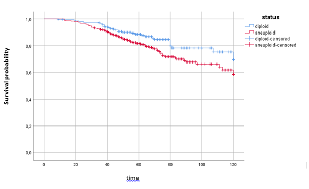 Methods. For the survival analysis İBM SPSS Statistics 25 was used. The data consisted of 568 women with the breast cancer divided into two groups based on the ploidy of the tumor cells. Kaplan-Meier method was applied for the estimation of the survival functions in the groups. Wilcohon statistic was found to test the null hypothesis of no difference regarding survival among the aneuploid and diploid groups.