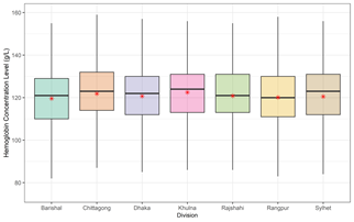 Data on the hemoglobin levels of women (15-49 years) were collected from the Bangladesh Demographic Health Surveys (BDHS). The most current survey was the 2017 BDHS; however, because hemoglobin level was not measured sequentially in the 2014 and 2017 BDHS, we used data from the 2011 BDHS. A two-stage stratified sampling design (20 strata, 600 EAs, 30 households per EA) was used to conduct the BDHS 2011 survey, which included all divisions (regions) and districts. The data set included 17,141 households and 17,842 ever-married women aged (15-49) years.11 In total, 5,699 women have had information on their hemoglobin levels.