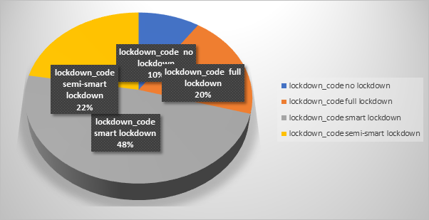 The results showed that 10% of deaths occur in No lockdown, 20% in Full Lockdown, 48% in Smart lockdown, and 22% in Semi-smart lockdown. The death ratio is less in No lockdown because the COVID-19 first entered in Pakistan Feb 2020, so No lockdown represents Feb 2020 to 13 March 2020. Another reason is that cases are very few at that time. The ratio of death in Full lockdown is normal because everything is closed in Full lockdown and there is no interaction between individuals except family members. The number of deaths in Smart lockdown is very high since the lockdown is half and more interconnection of people. The quantity of death is again decreased in Semi-smart lockdown because people were vaccinated (Figure 1).