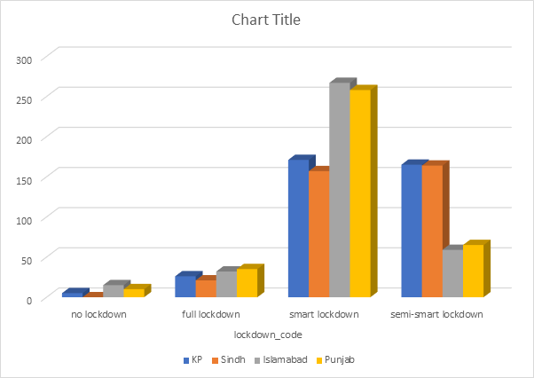 The analysis of coronavirus 2 (SARS-CoV-2), the number of confirmed cases, the number of deaths, the number of recoveries with No lockdown, Full lockdown, Smart lockdown, Semi-smart lockdown in Province KPK, Punjab, Sindh, and Islamabad. Both separate analysis and combined analysis of the provinces. The result shows that the lockdown is effective.
