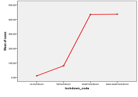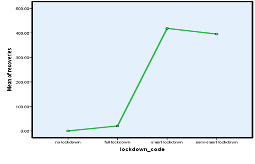 The following three-figure extremely define mean of cases, deaths, and recoveries with No lockdown, Full lockdown, and Semi-smart lockdown in Pakistan. Figure 5 shows that mean of cases less in No lockdown, then slowly high in Full lockdown. The cases are very firstly high in Smart lockdown and small change in Semi-smart lockdown. Figure 6 defines the mean of deaths in No, Full, and Smart lockdown are Same to cases graph (Figure 5), but deaths are fewer than cases. Then slowly decrease in Semi-smart lockdown. Figure 7 showed that the recovery change is moderate in Full lockdown and before the Full lockdown is compared to cases and deaths. In Smart lockdown, the recovery speed is high, because a lot of people were infected at that time. Then again decrease the speed of recovery in Semi-smart lockdown, and the result of one-way ANOVA showed in appendix that there is highly statistically significant difference among the mean of cases, death and recoveries in four groups (NO, full, smart and semi smart lockdown) with p value is less than 0.05 (i.e., p=0.000).