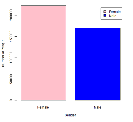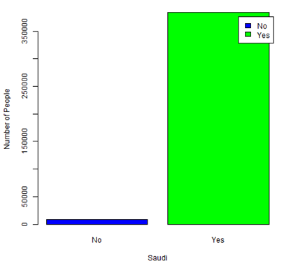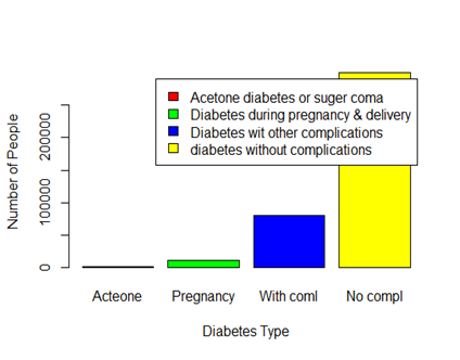 Figure 1 shows the number of patients according to the type of diabetes. It shows that the majority of the patients have diabetes without complications. The next largest category is the patients who have diabetes with other complications. Figure 2 shows that women are more likely to have diabetes than men. Most of the records of diabetes were found in Saudi population as Figure 3 shows. Figure 4 shows that most of the patients who have acetone diabetes or sugar coma are men. Both men and women have diabetes with other complications with approximately 45% and 56% respectively. This result suggests that both men and women are more likely to have diabetes with other complications.