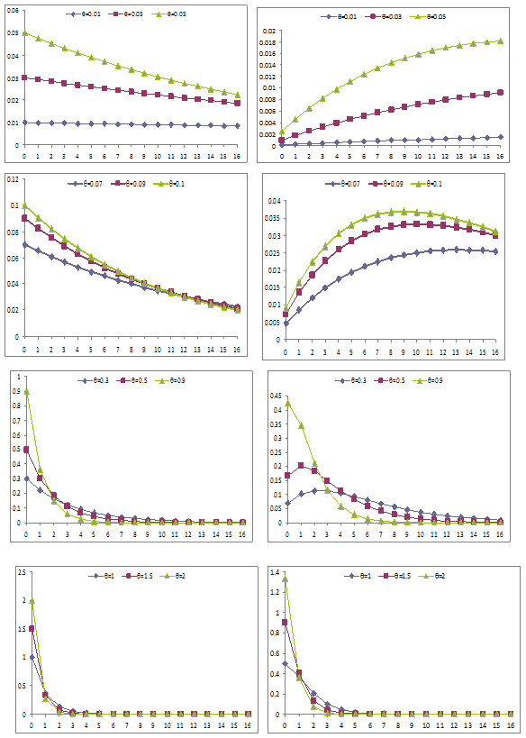 Figure 1 Graphs of the p.d.f. of exponential and Lindley distributions (left hand side graphs are for exponential and right hand side graphs are