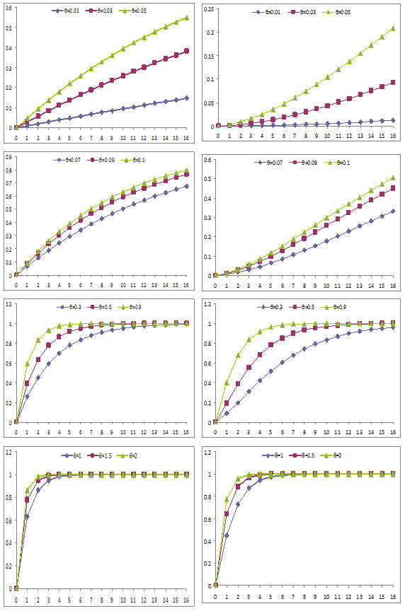 Figure 2 Graphs of the c.d.f. of exponential and Lindley distributions (left hand side graphs are for exponential and right hand side graphs are for Lindley).