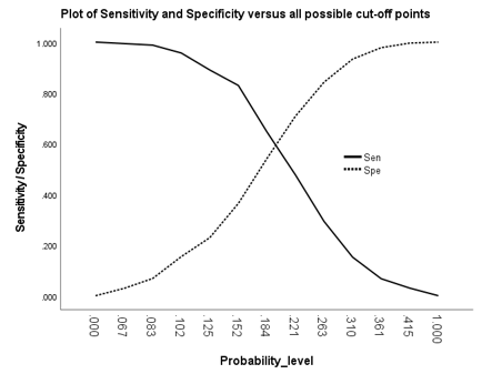 The optimal cut-off found by this method meets two conditions: (1) sensitivity and specificity obtained at this cut-point should be close to AUC value; (2) the difference between sensitivity and specificity obtained at this cut-point should be minimum.
