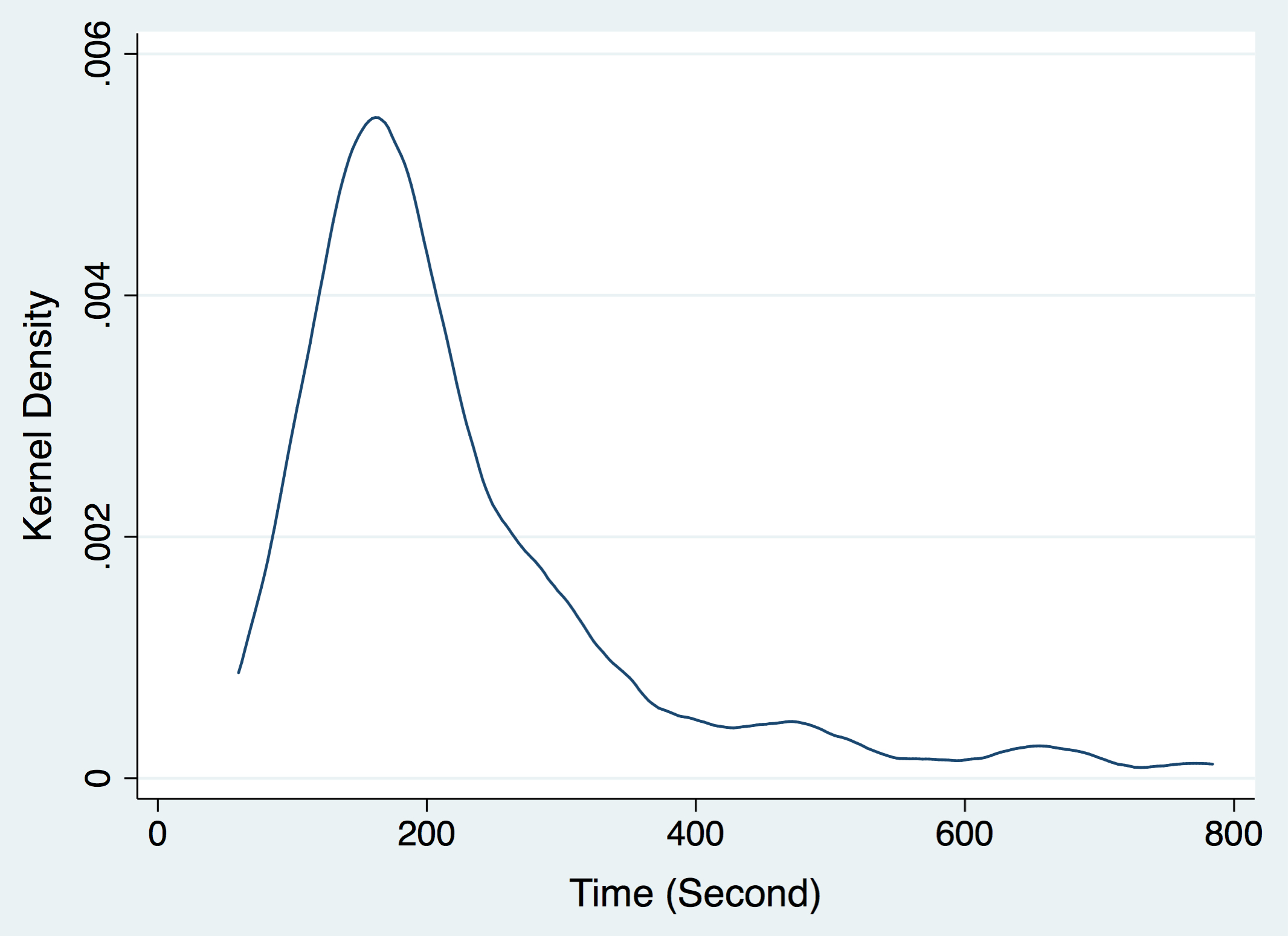 Figure 1, the kernel density plot of time, shows the overall distribution of the time required to complete the survey for all participants. Those who misspecified the duration as being less than 1 minute were removed; thus, the plot begins at around 60 seconds. The density peaked at just under 200 seconds and decreased beyond that, leaving a long tail on the right side. This is a typical right-skewed distribution, suggesting that ordinary normal distribution-based analysis might not work. Indeed, when we conducted the analysis, the model was quite unstable. Thus, we log-transformed the time variable and achieved a model effectively satisfying regression assumptions, such as homoscedasticity, although this is not described in detail here.