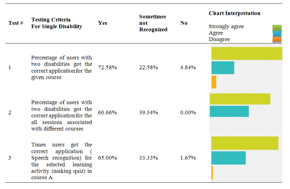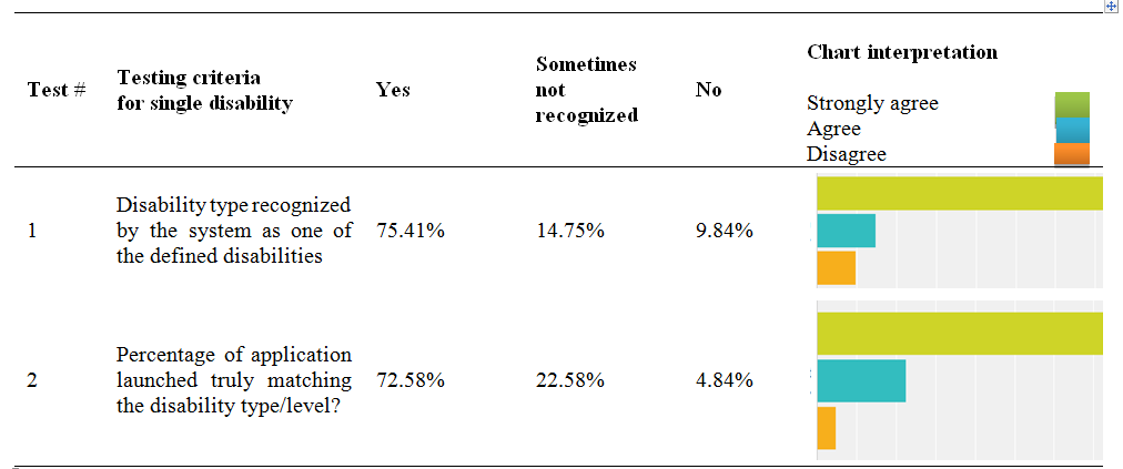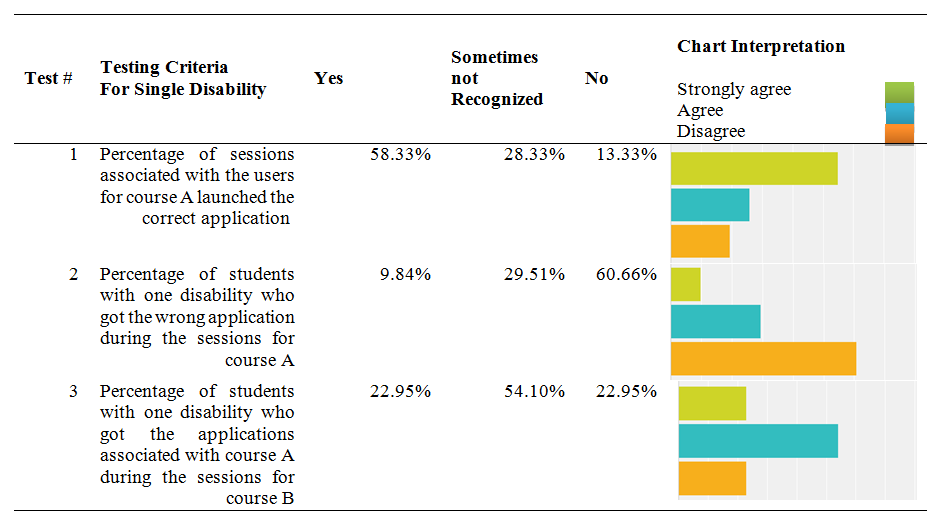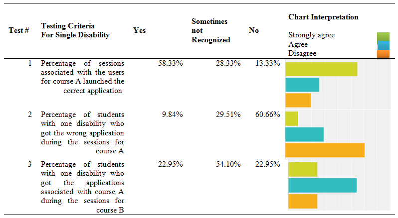 The experimentation results of the proposed system have been proven to be efficient in terms of the both recognition of the disability type of the student; and Table 4. In the results section Table 5 and Table 6, the system has been able to recognize after one training session for 60.6% of the cases of students with single disability whilst 22.95% of the cases for the multiple disabilities. Hence, in a single disability cases; about 60% of the students were able to use the correct launched applications and about 58% for multiple disabilities. The reason for the low percentage regarding recognized disabilities is the insufficient training for the system prior to use. Meanwhile, the user could spend more time on training so that the system could be able to record the required behavior in the user profile.
