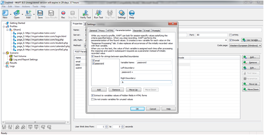 “WAPT can check all web site responses received during recording for dynamic values located between specified left and right boundaries. When such value is found WAPT creates a variable for it. During the test, the variable will be assigned a value extracted from the actual response using same rules. WAPT will also replace that value in the parameters of all subsequent requests, so that it would be taken from the variable.