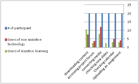 A comparison experiment is conducted to compare between the students mental processing time ( using the propose technology and without the proposed technology) in order to complete a task such as uploading and assignment, checking the calendar, converting media file, accessing project forum, and/or downloading a document. The average mental processing time has dropped by 30% using the assistive LMS over the regular LMS, Figure 7.