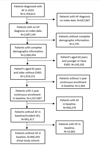 We utilized the Center for Medicare Services (CMS) Medicare 100% inpatient and outpatient claims data during the study period of 2013 to 2017. Medicare is the public health insurance program in the United States that primarily provides health insurance for persons aged 65 and older. The study included patients with first- time AF ICD 9 or 10 diagnosis codes (without concurrent CHF) in the year 2014 who had evidence of 1-year continuous enrollment in the baseline period (1 year prior to the index diagnosis date in 2014). Patients who had a prior history of AF in the baseline as well as patients with a prior CHF diagnosis in the baseline were excluded (to exclude non-incident AF and CHF patients). Patients with end stage renal disease (ESRD) and patients younger than 65-years old were also excluded. The study was considered IRB exempt by the University of Minnesota Institutional Review Board (IRB ID: STUDY00012178) on 3/5/2021, because the data was existing and de-identified. (Figure 1)