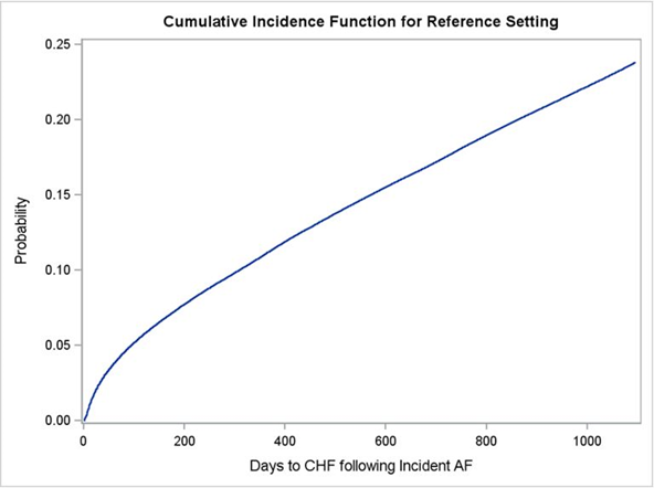 Results: With every 1-year increase in age of incident AF patients, 3-year risk of CHF increases by 2.6%, presence of coronary artery disease, COPD, diabetes mellitus, peripheral artery disease, and cardiomyopathy increases 3-year risk of CHF by 22.1%, 30.2%, 31.9%, 15.2%, 44.8%, and 6.3% respectively. Blacks with incident AF had 6.9% higher 3-year risk CHF than Whites. For the average aged female patient in our cohort (78.5years) with no comorbidities and death as a competing risk, we found the probability of CHF within the first 3 years after AF diagnosis to be 23.5%, 17.5% within the first 2 years, and 10% within the first year.