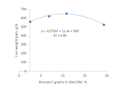 The benefits from brewers’ grains, added to a cattle fattening diet based on cassava pulp-urea-cassava foliage, were first demonstrated by,16 when replacing 50% of the cassava foliage by brewers’ grains (DM basis) led to almost doubling of the growth rate. In terms of diet composition this represented concentrations in the diet DM of brewers’ grains of 20% and cassava foliage 20%. In the present experiment the optimum combination appeared to be of the order of 9% brewers’ grains and 23% of cassava foliage (in diet DM). The two experiments cannot be directly compared as in the research of 17 the cassava was a “bitter” variety whereas in our study the cassava was a ”sweet” variety. Phuong et al (2016, personal communication) reported major benefits in growth of cattle (from zero to 600 g/day) when brewers’ grains (at only 4% of the diet DM) were added to a similar diet of cassava pulp-urea-cassava foliage. In this case the cassava was a bitter variety. It was also observed that urinary excretion of thiocyanate was substantially reduced by supplementation with the brewers’ grains. These authors concluded that the benefits from the small amounts of brewers’ grains (4% of diet DM) possibly were due to a “prebiotic” effect of this supplement in reducing the sub-clinical toxicity caused by the cyanogenic glucosides in the cassava foliage .
