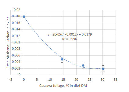 The ratio of methane to carbon dioxide (in the mixture of eructed gas and air in the plastic-enclosed chambers in which the cattle were confined individually over 10 minute periods) declined with a curvilinear trend as the fresh cassava foliage replaced brewers’ grains in the diet (Table 4 & Figure 4).