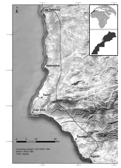 A two-stage methodology was adopted in order to facilitate field prospections for potential breeding and nesting sites on the Moroccan Atlantic coastline, which extends from Imsouane (30°50’38’’N; 9°49’26’’W), around 85 km north to Agadir, to Cap Tafelney (31° 06’10’’N; 9°50’02’’W), at 70 km south to Essaouira (Figure 1). First, we used Google earth images to identify five key cliffs and potential nest sections of the study area. The shoreline, length of approximately 25 km is characterized by live cliffs, which are made up of alternate beds of aeolianite (consolidated sand dunes), marls, and limestone, which give different sections vertical in parts only and separated locally by narrow sandy beaches. A band of coastal steppe of 1-2 km width, between the coast and the foothills of the High Atlas Mountains, is globally unintensively used.