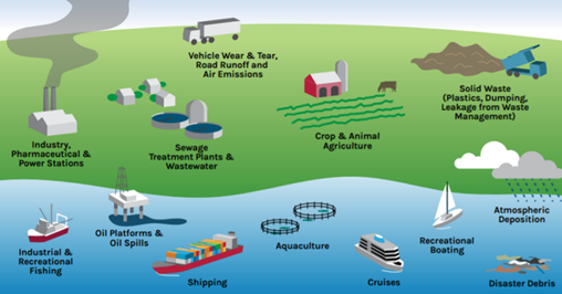 Figure 3 Sources of ocean pollution. Graphic published in Jambeck, J., E. Moss, B. Dubey et al. 2020. Leveraging multi-target strategies to address plastic pollution in the context of an already stressed ocean.