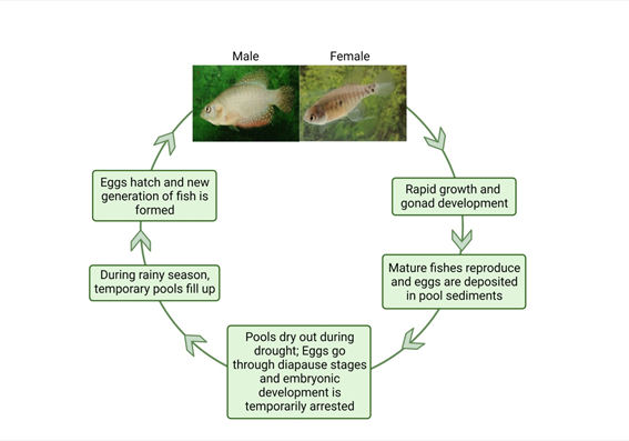 Fish reproductive strategies result from selection pressures on a species to produce the maximum number of young fish to survive under the prevailing environmental conditions, thereby maximizing fitness. With the onset of rainy season, under favourable environmental conditions, Cichlid fishes allocate resources to growth. However, under stressful conditions, they reproduce.(Figure 1) Natural selection would be expected to favor changes in allocation of a species resource from reproductive to competitive activities only where this enhances the survival of future offspring. Fishes which are subjected to different selection pressures would have characteristic life history patterns. In annual fishes, stress due to drought promotes reproduction, which likely guarantees its survival and reproduction in tropical temporary pools. (Figure 2).