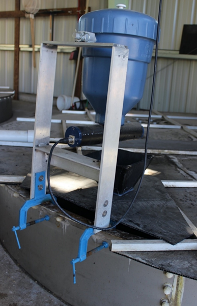 Figure 1 Image of a mount and automatic feeder installed on a 2.7-m diameter partially-in ground circular rearing tank.