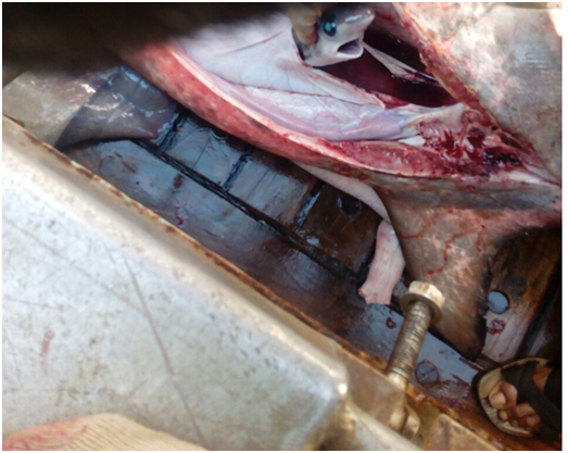 Fishery Survey of India (FSI), Port Blair, a sub-ordinate office under the administrative control of Department of Animal Husbandry, Dairying and Fisheries, Ministry of Agriculture and Farmers Welfare, Government of India, New Delhi carried out extensive exploratory survey on Oceanic Tuna and allied resources by operating Multifilament long line gear (Five hooks per basket) in the Andaman Sea by deploying a survey ship namely “MFV Blue Marlin” attached to the Zonal Base of FSI, Port Blair during April 2016. Two gravid sharks viz. Alopias pelagicus and one Alopias superciliosus were caught in the coordinates of Lat. 11°24.2’N and Long. 92°47.6’E and Lat. 11°29.6’N and Long. 93°22.6’E i.e. from the Eastern part of Andaman Sea. The morphometric measurements of the two shark species were recorded in centimetres by using the measuring tape and the weight of the species were recorded in kilograms by using spring balance. All the terminology related to this study along with morphometric and meristic characters for the present study were followed from.14,19, 26 For the biological studies, the fishes caught were dissected out onboard and the gut was cut open to find the contents by physical examination.