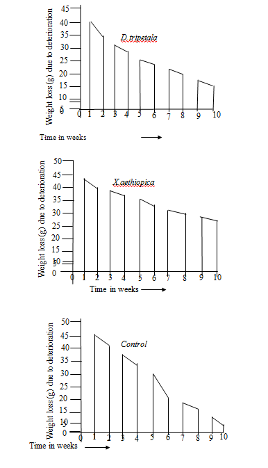 From the experiment conducted to compare the efficacies of the two spice plants in repelling D. maculates from the dry fish, it was observed that the insect pest (D. maculatus) was not found around the dry fish applied with the essential oils from the two spice plants (X. aethiopica and D. tripetala). However, some of the insects were found around the fish that was kept as control. Moreso, the decomposition rate of the two fish applied with the essential oils was significantly slowed down compared to the fish on control (Table 6). The slow decomposition rate was recorded more in the fish applied with EO from X. aethiopica than the one applied with EO from D. tripetale (see Bar Charts). It was therefore concluded from this experiment that the essential oils of the two spice plants (X. aethiopica and D. tripetala) were not only capable of repelling the insect pest of dry fish (D. maculatus) but were capable of slowing down decomposition rate in fish by inhibiting the activities of microbes which cause deterioration in fish. This is in line with the report of Rosell et al.16 that extracts from many spice plants have the properties of insecticidal and anti-microbial and are good for post harvest protection of stored products.