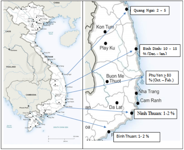 The main glass eel fishing areas are located only in the central area of Vietnam. Majority of the glass eels are caught by the fishermen onlyat two provinces viz., Phu Yen and Binh Dinh, which account for over 80% and 10-15%, respectively. Some other provinces also have natural sources of glass eel are Quang Ngai (about 2-5%), Khanh Hoa (about 1%), and Ninh Thuan (about 1%). It seems likely that the fishermen could be able to collect eels throughout the year, depending on the area there is certain peak seasonality (Figure 2).