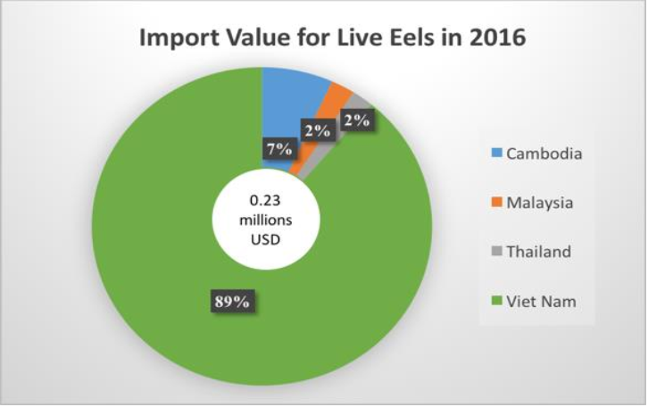 According to SEAFDEC (2019) report, more than 1000 eel farms are distributed in the southern provinces of Vietnam, and 95% of the total number of farms produce giant mottled eel (A. marmorata), mostly (70%) of which are used for domestic consumption (in the restaurant as Vietnamese Anguillid eel soup, deep fried, fried with curry, steam, etc.). Remaining 30% of the production is exported to the adjacent countries (e.g., Taiwan, China and Japan) in which fish market with expensive Japanese eel (A. japonica) is supplemented with more affordable giant mottled eel.1,6 Figure 4 shows the share of the live eels import (in value) by four importing countries, namely Cambodia, Malaysia, Thailand, and Vietnam. A big bulk (89%) of the total live eels imported by the Southeast Asian region was made by Vietnam, while (7%) was made by Cambodia which mainly came from the Philippines.7