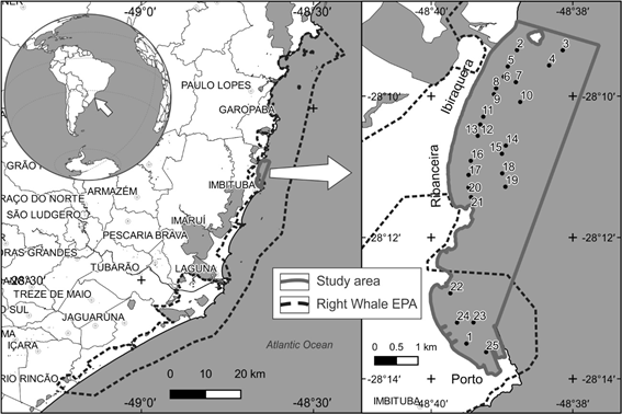 Figure 1 Location of Ribanceira/Ibiraquera and Porto bays in Imbituba-SC, highlighting the boundaries of the Right Whale EPA and the study area.