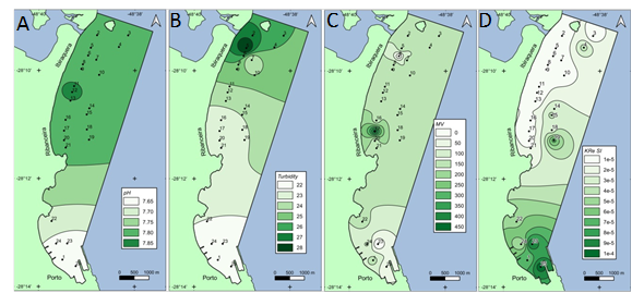 Representative maps: Figure 3 (A–C) shows that pH and turbidity present a gradient with an increase in the values of these variables from south to north. On the other hand, magnetic susceptibility shows a decrease in these values towards the north (Figure 3D). Stations 11, 12, 13 have a higher pH (Figure 3A). Figure 3B shows the delimitation of the area of maximum turbidity where a region similar to the estuary is located in season 5 and also a gradient that relates to the supply of fresh water from the Ibiraquera Lagoon bar. It is observed front between two different bodies of water. Station 17, on the other hand, has a higher particle size average (standard deviation). Magnetic susceptibility values are higher near the port, with pH and turbidity being lower.
