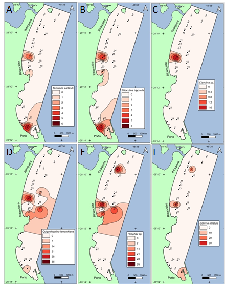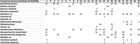 Relative frequency: Fifteen species of foraminifera were recorded in the sampling carried out in the study area, with 9 stations (2, 5, 6, 9, 11, 12, 13, 20 and 24) being sterile. The species peruviana Buccella , Elphidium sp. , Pseudononion atlanticum and Quinqueloculina spp. were the predominant foraminifera species in the sampled seasons, followed by Bolivina spp. , Miliamina fusca , Miliolinella subrotunda , Reophax and Textularia earlandi (Table 4).