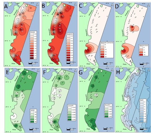 Figure 5 Data on (A) diversity, (B) equitability, (C) Miliolinella subrotunda, (D) Miliammina fusca, (E) salinity, (F) convexity, (G) roundness, (H) bathymetry at the collection stations.
