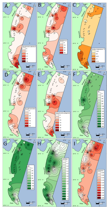 Figure 6 Distribution of Pseudononion atlanticum (A), Elphidium sp. (B), Temperature (C), Buccella peruviana (D), Patagonian Quinqueloculin (E), M / A (F), MN (G), L / W (H), and dominance (I).