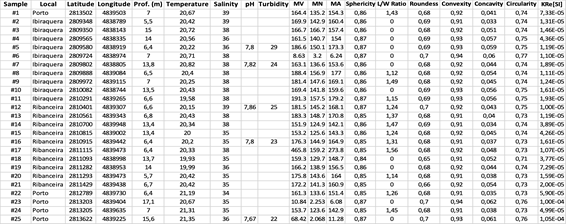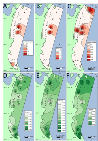 Observations also point out that the region of medium turbidity has water with less salinity and roundness of the grains, however with greater diversity and evenness of species in the central part. In the southern part, we observed an increase in diversity with the appearance of Miliolinella subrotunda and Miliammina fusca. Romano et al.35 studying the relationship of grain size in the marine sediments of a highly impacted harbor in Sicily, Italy, observed a clear regression in the density and diversity of foraminifera, with the exception of Miliolinella subrotunda, which had an increase in dominance, in less polluted places. This species optionally builds a long flexible tube several millimeters above the sediment, which allows the organism to feed on particles in the stream just above the surface of the sediment, apparently with higher nutritional values and a greater amount of food.36