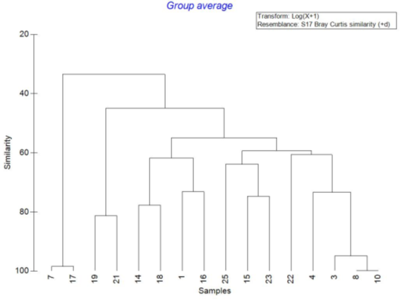 Group a: stations 7 and 17 (low number of species). Group b: 19 and 21 (high evenness and high number of species). Group c: 14, 18, 1 and 16 (high number of species). Group d: 25, 15 and 23 (high and low number of species). Group e: 22, 4, 3, 8 and 10 (low number of species, low diversity, high dominance).