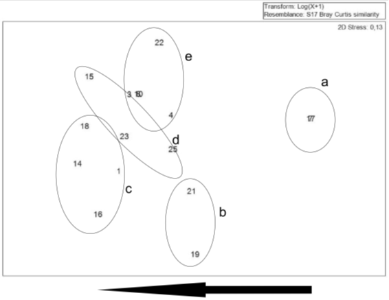 Groups formed in the cluster analysis were evidenced by MDS analysis (Figure 9). Variation in the cluster occurred mainly because of diversity of species. Group (a) with stations with low number of species; group (c) with groups the stations with a high number of species.