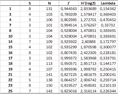 Table 5 Shows that number of species (S) varies between 3 (stations 7, 8, 10, 17) and 8 (1, 16, 18, 21, 23), the number of individuals (N) varies between 101 (station 7) and 150 (23), evenness (J) varied between 0.78 (3) and 0.99 (7, 17, 19), diversity (H´log2) varied between 1.27 (4) and 2.83 (1) and the dominance (lambda) varied between 0.14 (18) and 0.47 (4)