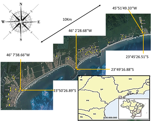 According to Köppen,14 the climate in the Bertioga region is classified as type Af (tropical with rain all year round), with annual average temperatures around 24 ºC and yearly rainfall of 3,207 mm, with the highest average values occurring in January, February, and March, while the lowest in June and July, revealing a water surplus in all months of the year.15
