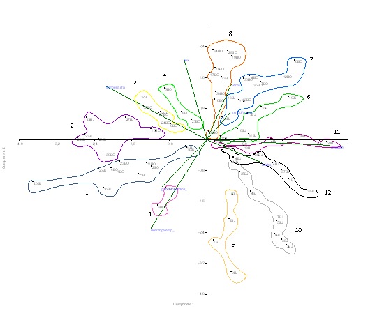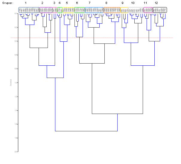 Moreover, the projection of the axes on the principal component (Figure 2), where the same groups were found, tries to identify and characterize the similarities. The Dendrogram (Figure 3) with a cutoff line in height close to 0.4 gives rise to twelve subgroups with similar characteristics, and three large groups that involve the twelve, found when characterized by the subgroups and showing similarities: