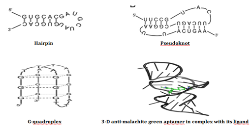Aptamers are single-stranded nucleic acids with defined tertiary structures which selectively bind to target molecules. Aptamers also possess ability to bind a complementary DNA sequence to form a duplex structure. The Duplex is formed between a fluorophore labelled DNA aptamers and a small oligonucleotide which is modified with a quenching moiety (denoted QDNA). When the target is absent, the aptamers bind to QDNA, then after it brings the fluorophore and the quencher into close proximity for maximum fluorescence quenching. When the target is introduced, the aptamers prefer to form the aptamer-target complex. The switching of the binding partners for the aptamers occurs in conjunction with the generation of a strong fluorescence signal owing to the dissociation of QDNA. Aptamers are capable to form stable three-dimensional structures in aqueous solution. Single-stranded oligonucleotides follow the same rule of complementarity of nucleic acid bases as do double-stranded molecules, thus it is relatively simple to predict their secondary structure. Different types of secondary motifs of Aptamers are (a) Hairpin (b) Pseudoknot (c) G-quadruplex (d) Three-dimensional representation of an anti-malachite green aptamer in complex with its ligand. The process of folding structures in the solution and the ligand-induced conformational changes were studied to be strongly dependent in the presence of divalent cations. Structures can be experimentally determined by crystallography.5 or Nuclear Magnetic Resonance (NMR) spectroscopy (Figure-1).