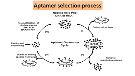 Aptamers are generated from a library of nucleotides or proteins containing approximately more than 1015 different molecules and are selected In vitro by SELEX process.3 Great efforts have been made to make aptamers clinically relevant for detection of diseases like viral disease (cancer, HIV) and macular degeneration. Aptamers are highly specific, relatively small sized, non-immunogenic oligonucleotides that have molecular recognition properties and are advantageous over antibodies .4