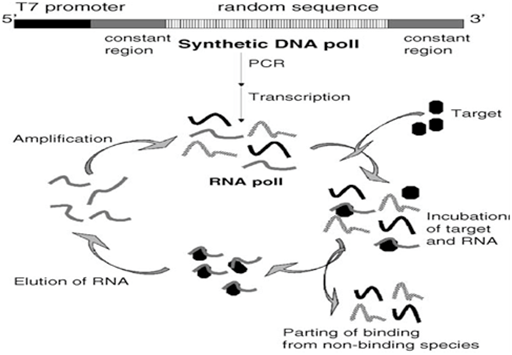 Development of aptamer by SELEX technique enablesthe selection of specific oligonucleotides from library of randomized molecules. SELEX method has characteristics to identify the unique RNA/DNA molecules, from very large populations of random sequence oligomers (DNA or RNA libraries). Aptamers possess a randomized region of 30–50 nucleotide flanked by constant sequences which helps in PCR amplification.The criteria of SELEX is to stimulate evolution (Systematic Evolution of Ligands). It can be done with both ways by introducing many rounds of selection (usually 10–15) and by exponential amplification of ligands via PCR after each round (Exponential Enrichment). Finally, the DNA strands are separated and those corresponding to the original library strands are subjected to a next round of selection.2 The manipulation of selection parameters (pH, temperature or buffer composition) can be easily done to obtain optimal aptamers. At the initial step, incubation of DNA/RNA sequences from library is done with an immobilized target. Unbounded DNA/RNA molecules are washed away and the ligands that get binded are eluted and amplified, either by the process of standard PCRor RT-PCR in the case of RNA aptamers. On the completion of several rounds, the selected molecules are randomly cloned and sequenced. Aptamers have a very high affinity to their targets, with dissociation constants varies from the micromolar to low picomolar range, comparable to those of some monoclonal antibodies, sometimes even better. Single-stranded DNAs also fold In vitro, structures forming like stem-loop, internal loops, etc., even if less stable than the corresponding RNA structures.6 High-affinity aptamers after being selected bind to hundred different target molecules such as organic dyes.7 amino acids.8 antibiotics .9 peptides 10 proteins .11 and vitamins .12 (Figure- 2).