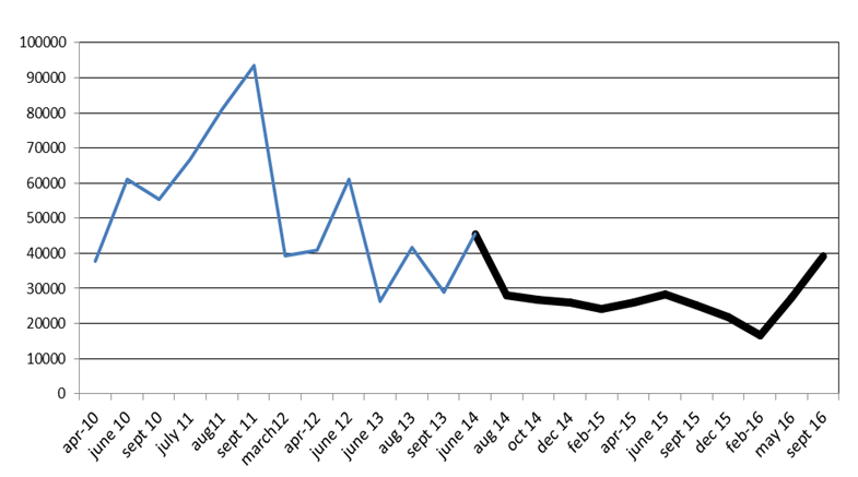 In Table 1, the total number of working days for all the available boats is reported on a monthly basis, and for the three different periods of boat interventions. Each unit of the number of working days corresponds to the daily action of the boat in a sub-sector. Since April 2015, the use of two boats has been lost, due to various breakdown never repaired; this was tartly compensated with the increasing shifts with the other two boats available.