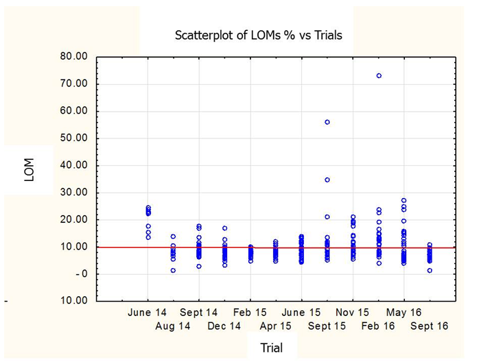 The scatter plot of Figure 3 shows the LOM data dispersion along the vertical axis for each trial. It confirms 1) the uniqueness of June 2014 compared to all other trials, with the data showing above the regression curve, 2) the greater homogeneity of the data and their relatively lower values, more concentrated and mostly below the curve, between December 2014 and June 2015, the second part of the first period, and 3) the increase and a greater data dispersion with many records above the curve in the following periods.