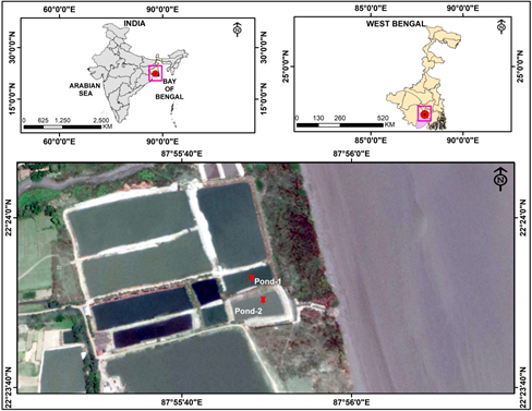 The experimental culture ponds are located in Kolaghat, West Bengal, India located adjacent to Rupnarayan River, which is a tributary of the river Ganges. The site along with two cultured ponds is depicted in Figure 1. The fry was stocked in two different ponds at Kolaghat, West Bengal, and filled with water of the Rupnarayan River. The sampling is conducted over the time period of 8 months from May to December, 2019. The two culture ponds are named as Pond 1 (0.54 acre) and Pond 2 (0.44acre). The river water is the main source of water for the experimental culture ponds.