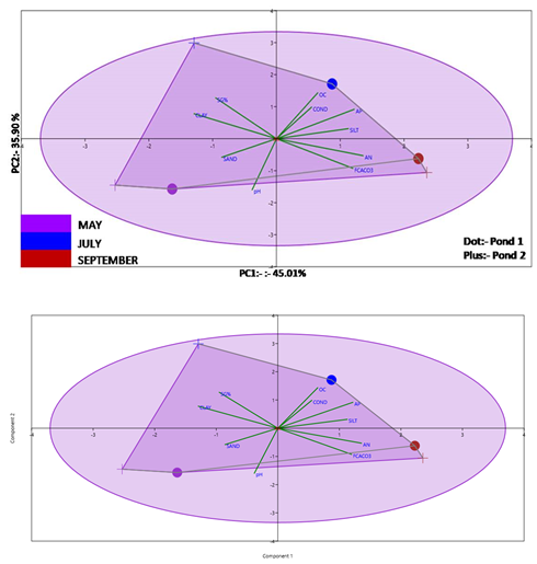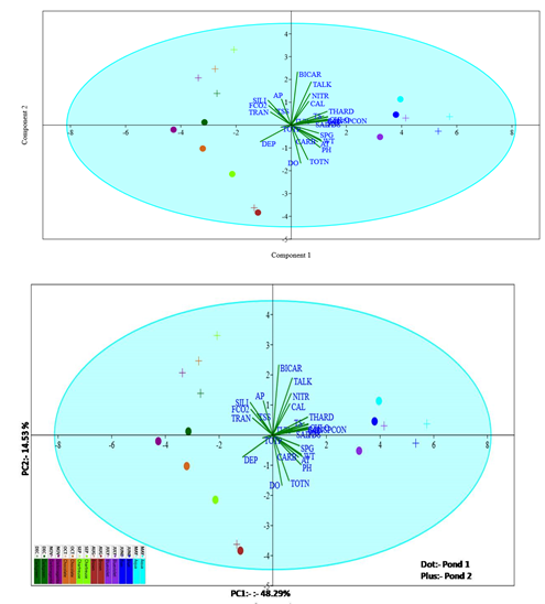 Principal Component Analysis (PCA) is the effective statistical tool used for analysing major influencing factors responsible for pond production. It was performed by taking 27 important water quality parameters i.e. Air temp (AT), Water temperature (WT), Depth, Transparency (Trans), Turbidity (TUR), Sp. Conductivity(Sp.CON), pH, DO, Total Alkalinity (TALK), Carbonate, Bicarbonate, Free CO2, Chlorinity (chlo), Salinity(SAL), TS, TDS, TSS, Total N, Silicate, Total P, Total Hardness, Calcium, and Magnesium. For both, ponds, a PCA bi-plot was created to know the differences. In the PCA bi-plot, it has been found that the cumulative variance percentage for PC I and PC II was 62.82 % and among the PCI, PC II, and PC III the major driving factors are water temp, Chlorinity, Total alkalinity, salinity, sp. cond, TS, TDS, and Magnesium. In the analysis, the major factor (Figure 5) influencing specific growth % were water temperature, air temperature, pH, carbonate, and total nitrogen. In pond 2, the maximum of growth was observed in the month of June, while the maximum sp. growth % in pond 2 was in July (Table 4). The colour coding is shown different months and plus sign shows pond 1 and dot sign shows pond 2.