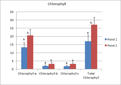 Figure 3 Pattern of chlorophyll in the both ponds during the study period(chlorophyll-a, chlorophyll-b, chlorophyll-c, total chlorophyll). Data represents (mean±SE), Mean bearing common superscript are not significant to each other.