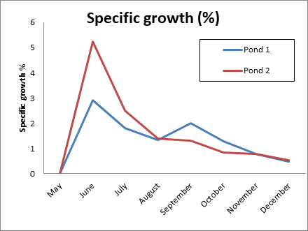 d was duration of the fish rearing (30 days here for monitoring month wise specific growth rate).