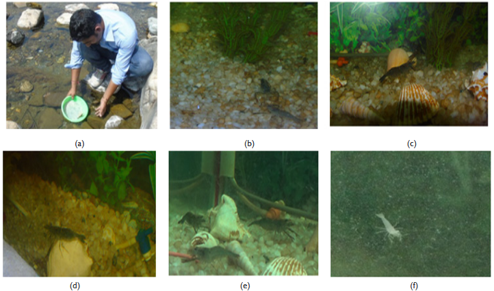Figure 1 a) Sampling process in Khoh stream; (b) Mating behavior in the aquarium; (c) Female on Bottom in the aquarium; (d) Gravid female in an aquarium; (e) Female before egg-laying; (f) Early Hatched Larva in the aquarium.