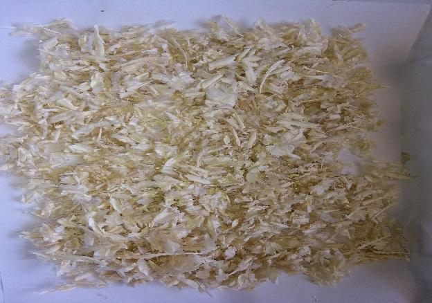 Deacetylation: Chitin flakes in the conical flask were added with 50 % sodium hydroxide solution (1:5; w/v). It was incubated at 28°C±3°C for 3 days and then the liquid was filtered and the solid filtrate was collected separately in a conical flask. The filtrate was washed and dried. The dried extract chitosan (Figure 2) was weighed and the yield (%) was calculated as;