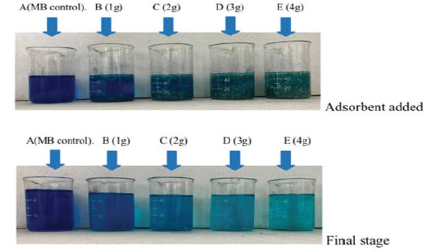 The Effect of adsorbent dose: The experiment for the observation of adsorbent dose effect was carried by adding 1g to 4g of adsorbent for 50ml solutions in 4 experimental glass beakers respectively for determining the optimum adsorbent amount in which there is complete decolourization of methylene blue dye.