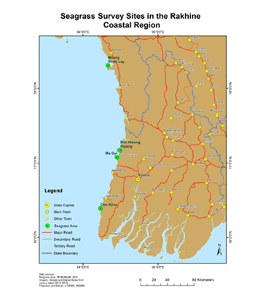 Seagrasses occur all along three Coastal Regions of Myanmar, namely Rakhine, Ayeyarwady Delta and the Gulf of Mottama (Martaban) and Taninthayi. Ten species of seagrasses has been described in Myanmar and include, viz., Syringodium isoetifolium (Ascherson) Danty, Cymodocea serrulata (R. Brown) Ascherson et Magnus, C. rotundata Ehrenberg et Hemprich ex Ascherson, Halodule uninervis (Forsskal) Ascherson, H. pinifolia (Miki) Den Hartog,9 Enhalus acoroides (Linnaeus f.) Royle, Thalassia hemprichii (Ehrenberg) Ascherson, Halophila beccarii Ascherson, H. decipiens Ostenfeld and H. ovalis (R. Brown) Hooker f.10-15 Their importance to Myanmar fishers is well known with local people calling seagrasses Leik-Sar-Phat-Myet, meaning the food of marine turtles. In addition, the seagrass meadows are known to serve as important feeding grounds for the sea cow, Dugong dugon which is recognized as endangered species under the IUCN Red list. Given their importance, both ecologically and economically, and the global decline in segarss beds, the protection of seagrasses within Myanmar is seen as paramount. The objective of this study was to know the updated information on the current status of biodiversity, distribution and coverage of seagrasses at select sites within the Taninthayi and the Rakhine Coastal Regions of Myanmar. This information will be used to guide the creation of Marine Protected Areas within Myanmar to ensure such habitats are conserved and used for long term monitoring of seagrasses.